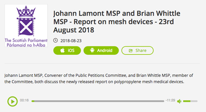 | 20 August 2018: Podcasts By The Scottish Parliament: Johann Lamont MSP, Convener of the Public Petitions Committee, and Brian Whittle MSP, member of the Committee, both discuss the newly released report on polypropylene mesh medical devices | ![]() |